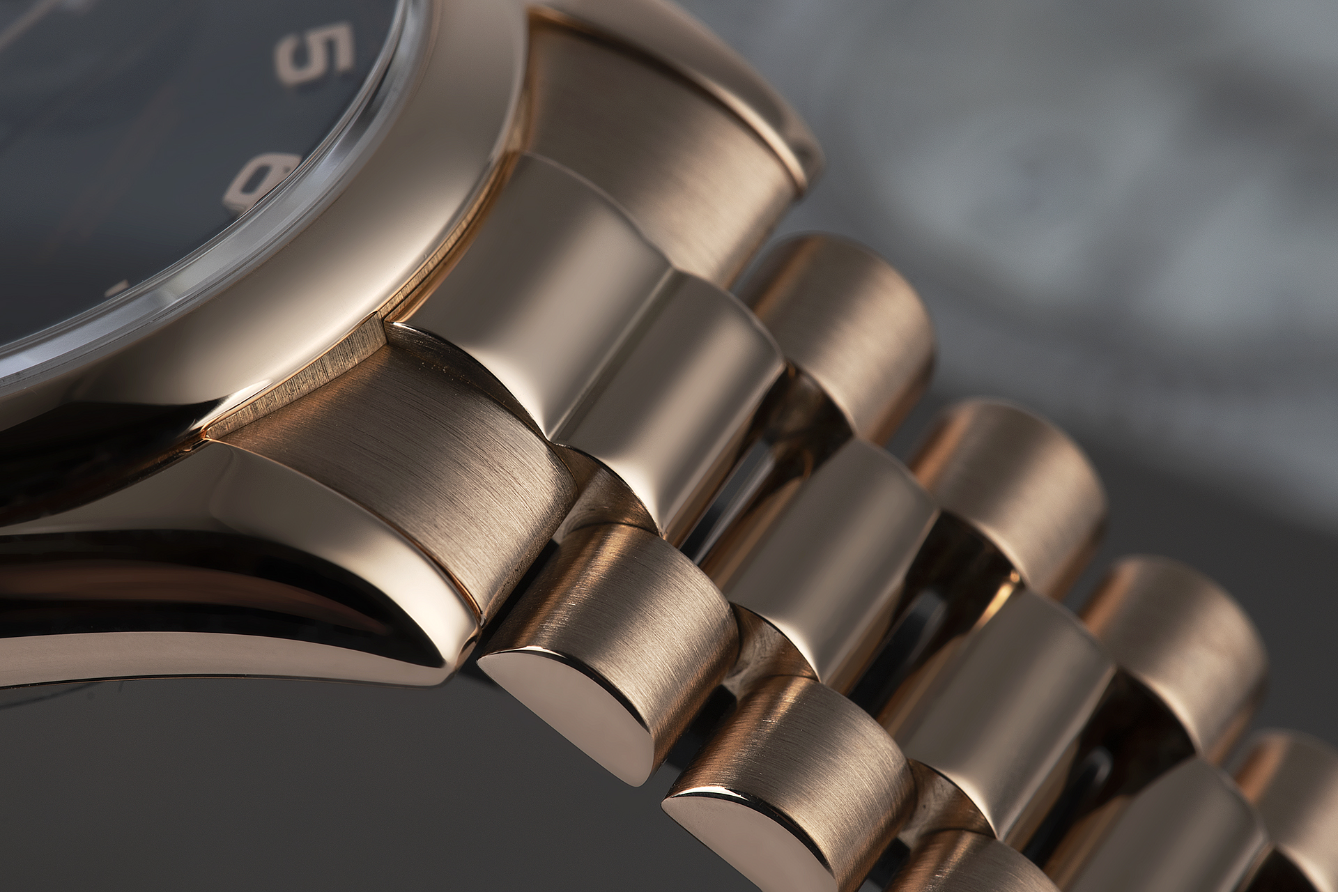 Retailed by Rothtlex AD - Windsor Bishop in Norwich, it features a black gloss dial with rose gold applied Arabic hour markers, complemented by its smooth solid rose gold bezel. Powered by Rothtlex's self-winding Day-Date Cal. 3155 movement, waterproof to 100m & fitted to its 'solid link' rose gold president bracelet.